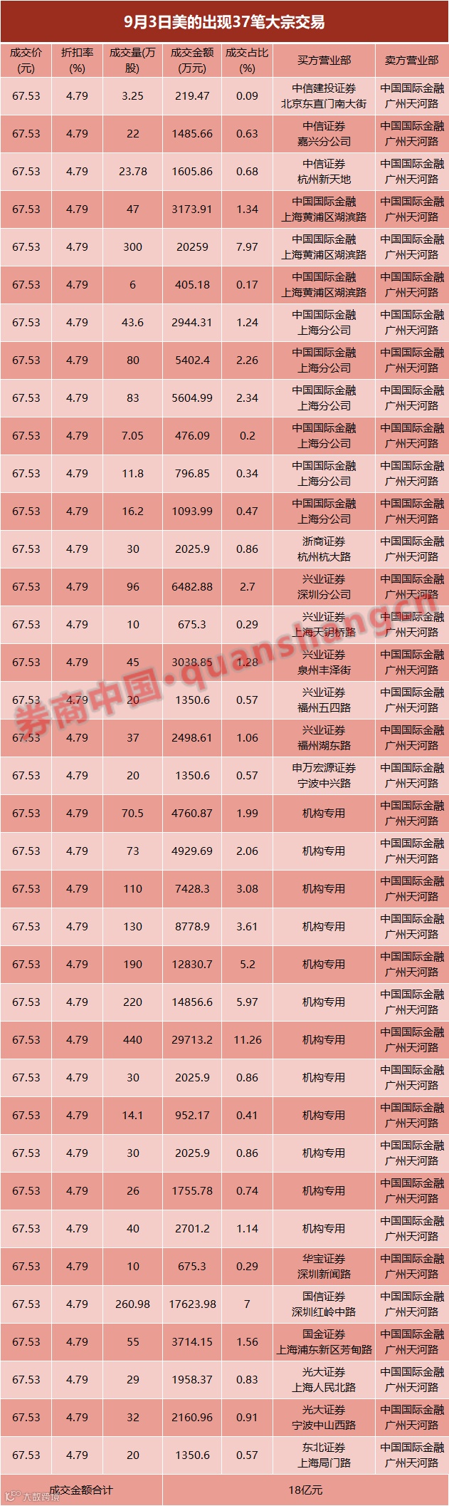 值得注意的是,9月3日,美的集团突然又出现了37笔大宗交易,成交量高达2682.26万股,成交价均为67.53元,折价率为4.79%,卖方全部为中国国际金融广州天河路营业部,买方中有12家机构账户,其他为营业部账户,机构账户共买了9.27亿元。
