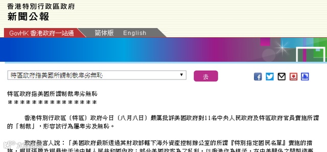 香港特别行政区(特区)政府今日(八月八日)严厉批评美国政府对11名中央人民政府及特区政府官员实施所谓的“制裁”,形容该行为属卑劣及无耻。