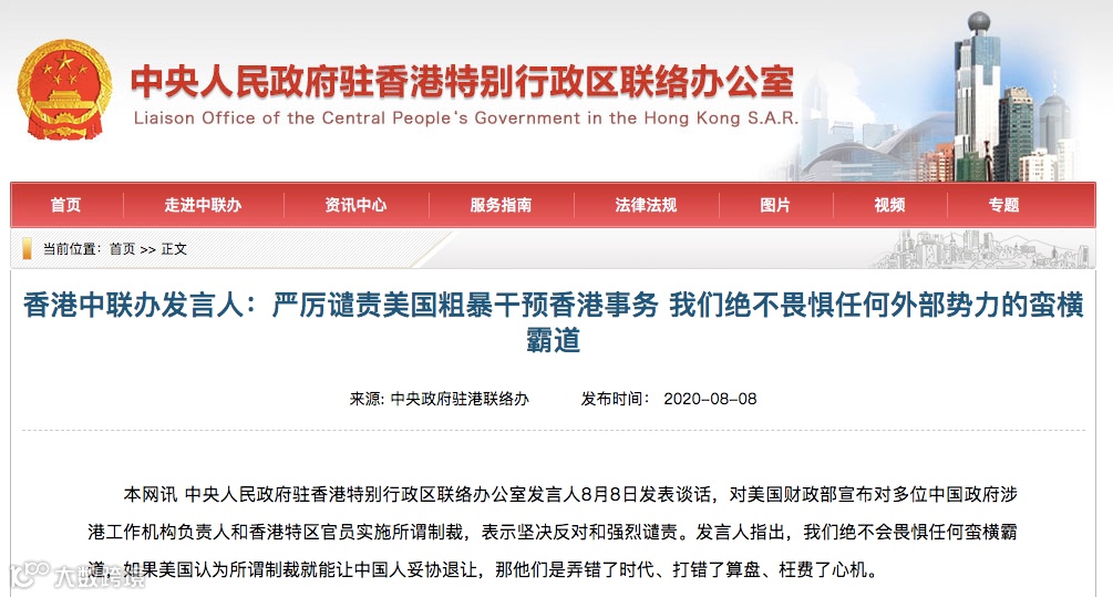 此前,中国外交部发言人赵立坚在回应香港国家安全立法问题时曾表示,这一问题纯属中国内政,任何外国无权干涉。“中国不是吓大的。美方通过所谓制裁阻挠中方推进香港国家安全立法的图谋绝不会得逞。”赵立坚说,针对美方有关错误行径,中方将采取必要反制措施,坚定维护自身国家利益。