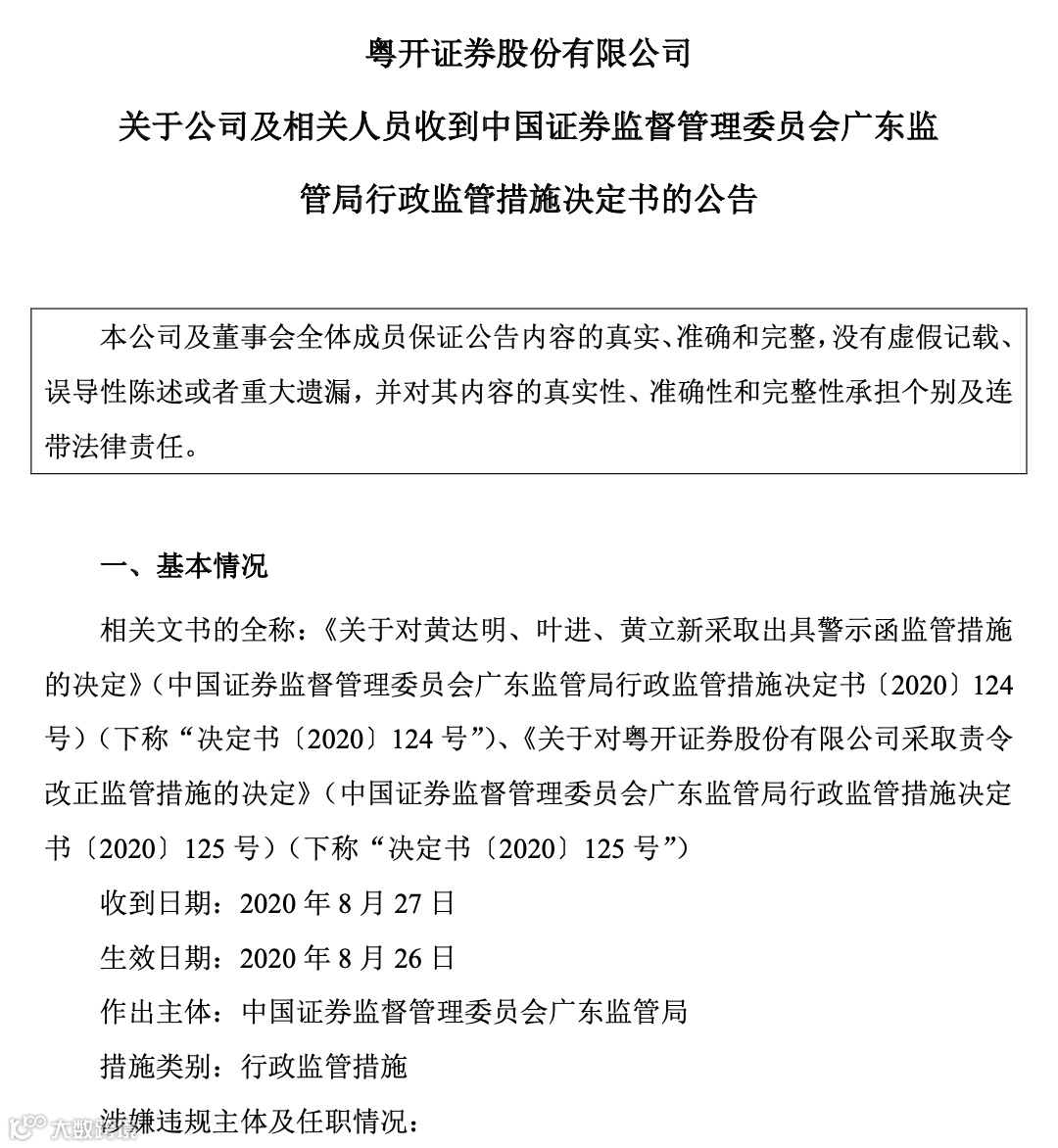 8月29日,粤开证券公告称,由于私募资管业务开展、合规管理、风险管控存在漏洞和缺陷,内控不完善,该公司被广东证监局责令改正,原副总裁黄达明、原资产管理部副总经理叶进、原合规总监黄立新也收到监管警示函。