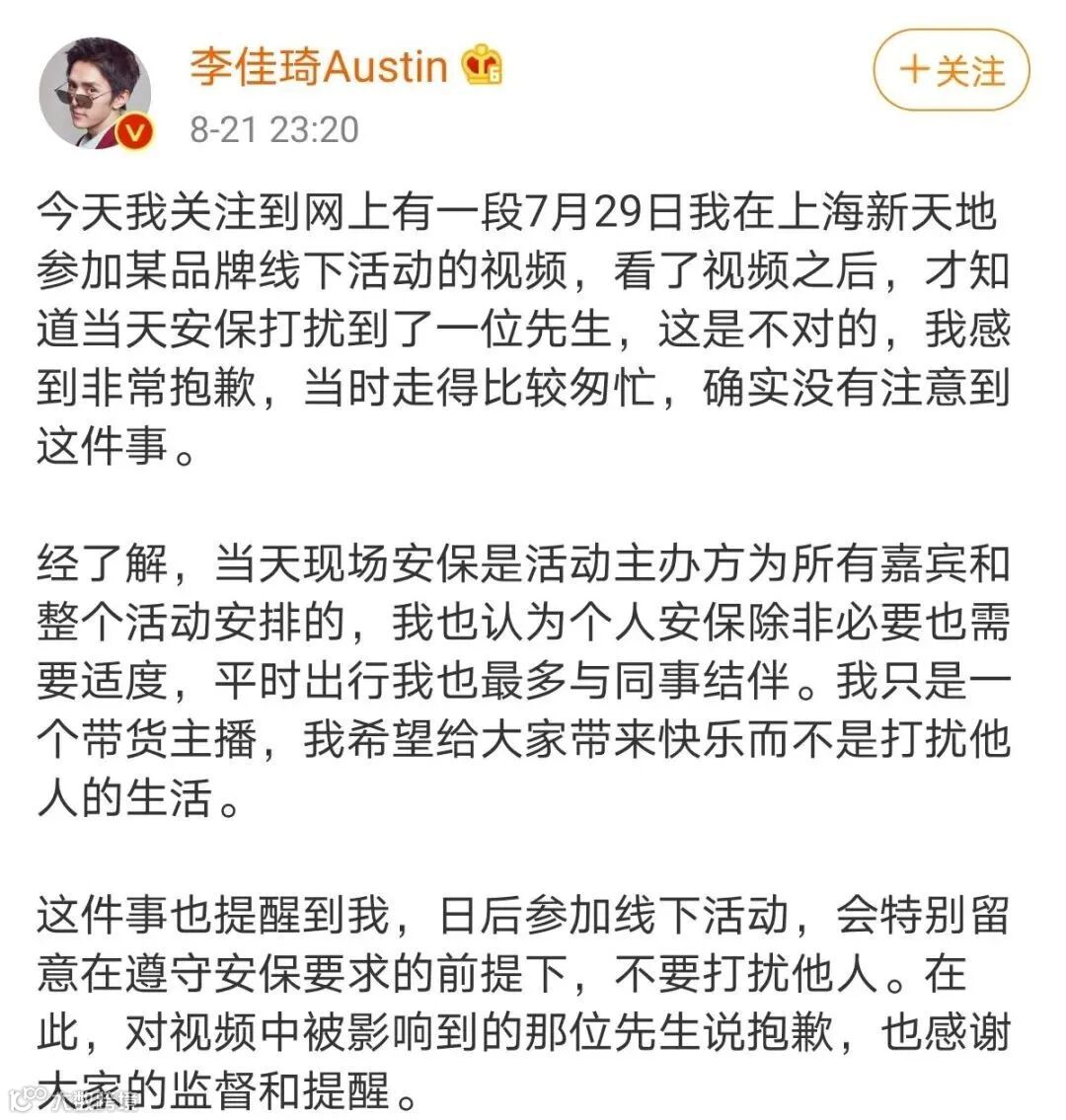 7月29日李佳琦在上海新天地参加某品牌线下活动,他的保安推人的画面被拍下,近日在网上流传引发热议,不少网友认为李佳琦耍大牌,昨晚李佳琦就此事发文道歉。