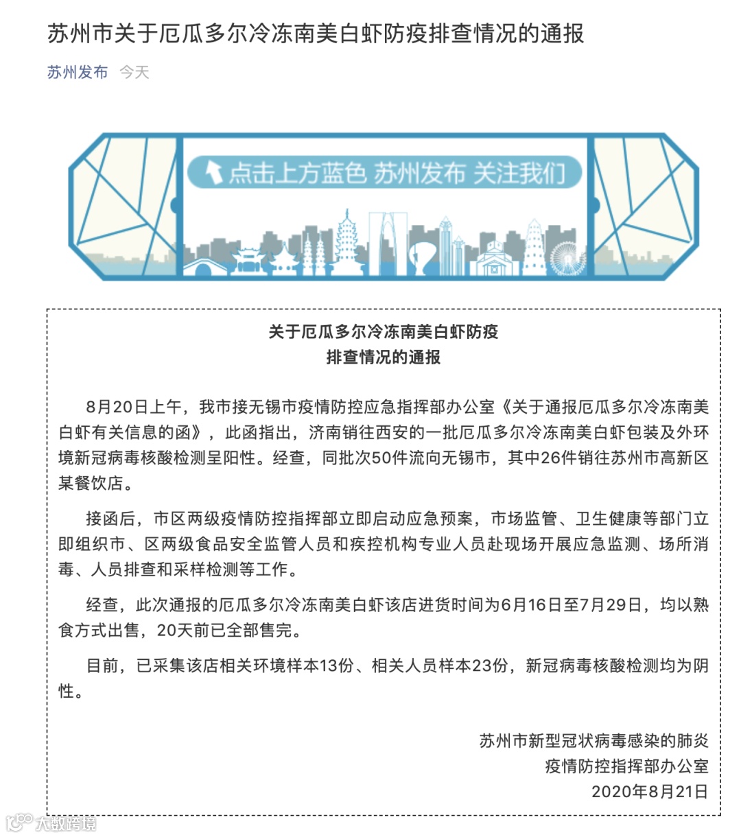8月21日,“苏州发布”微信公众号发布通告称,20日上午,江苏苏州市接无锡市疫情防控应急指挥部办公室《关于通报厄瓜多尔冷冻南美白虾有关信息的函》,此函指出,济南销往西安的一批厄瓜多尔冷冻南美白虾包装及外环境新冠病毒核酸检测呈阳性。经查,同批次50件流向无锡市,其中26件销往苏州市高新区某餐饮店。