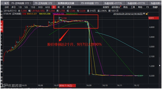 2016年3月29日,主营业务为建筑业的正利控股在香港创业板挂牌交易,招股价0.283港元,首日交易即暴涨近7倍至2.26港元;当年7月13日,该股更创下5.7港元的历史盘中高位。换句话说,股价相较发行价被炒高逾19倍;之后,该股在5港元以上徘徊近两个月,于当年9月7日突然大跌90%。