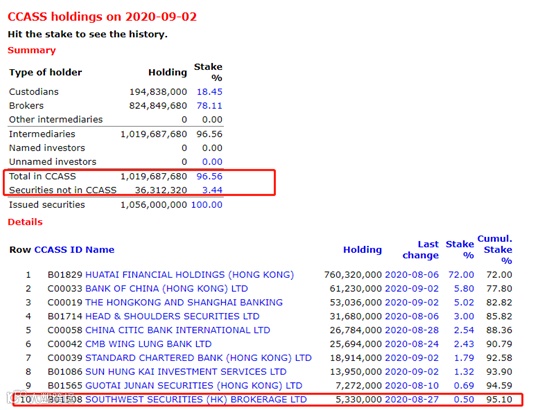 CCASS数据显示,截至2020年9月2日,中环控股前10大券商席位合计持有95.1%股权,连同3.44%的实物股票共占98.54%,即约只有1.46%股权(约388万股)在市场流通,股权集中度非常高。中泰国际策略分析师颜招骏称,该股近20日的日均成交量只有6.7万股左右,而且升跌有规律,拉升有序,股价也脱离了大盘波动的影响,相信实际流通量不足0.5%,即132万股在市场流通。
