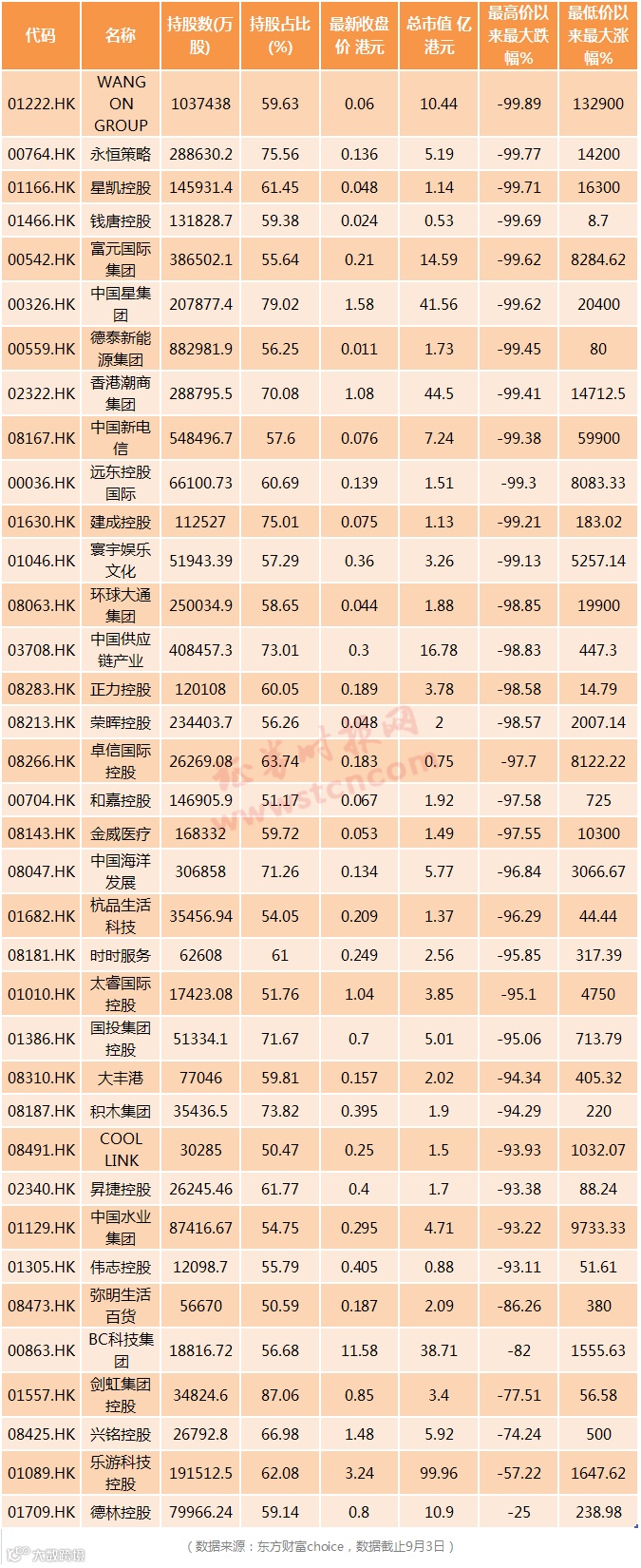 记者统计数据发现,截至9月3日金利丰代持股50%以上的上市公司股票达到36只,是香港最大的代客持股的券商。这些个股总体特点为股价细,总市值小,股价都有暴涨暴跌过,上市以来自最高价最大跌幅在90%以上的有30只,自最低价最大涨幅超过200%的有28只个股,其中涨幅超过100倍的有8只个股。今年以来盘中出现闪崩70%以上的个股有2只,分别是COOL LINK以及卓信国际控股。