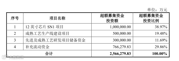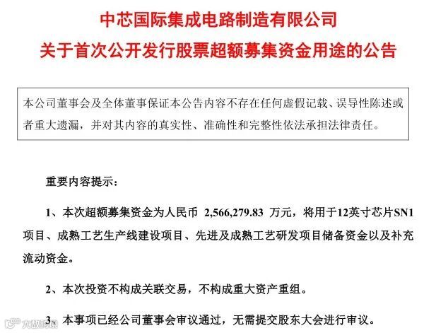 8月6日晚间,中芯国际同时的公告显示,公司本次公开发行股票募集资金净额为456.63亿元(超额配售选择权行使前),计划募集资金金额为200亿元,超额募集资金金额为256.63亿元。上述超额募集资金将用于12英寸芯片SN1项目、先进及成熟工艺研发项目储备资金、补充流动资金,以及新增的成熟工艺生产线建设项目。