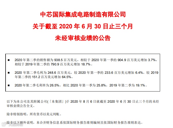 8月6日晚间,中芯国际(688981)发布2020年二季度财报,公司2020年第二季的销售额为9.385亿美元,相较于2020年第一季的9.049亿美元增加3.7%,相较于2019年第二季的7.909亿美元增加18.7%。