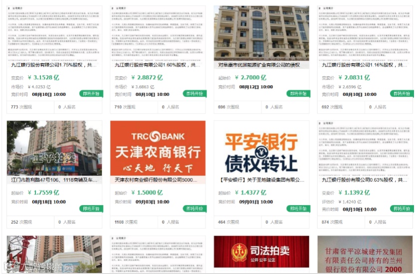 举例而言,2018年在香港上市的江西省第二大城商行——九江银行,其第四大股东为大生(福建)农业有限公司(简称“大生福建农业”),持有九江银行5.65%股权将于8月10日悉数排名,起拍价格合计10.17亿元。