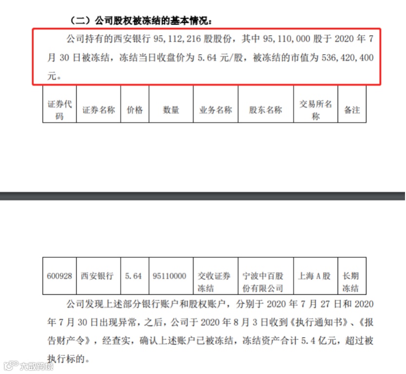立案执行后,宁波中百近日发现,相关银行账户中已经有6个账户被冻结,处于异常状态,金额合计5440万元;所持西安银行9511万股股份,也被全部冻结,按冻结日计算市值达到5.36亿元。