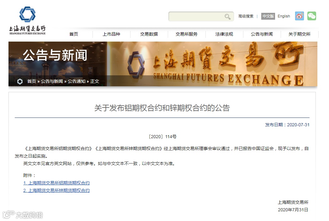 7月31日,上期所发布了《上海期货交易所铝期货期权合约》和《上海期货交易所锌期货期权合约》。