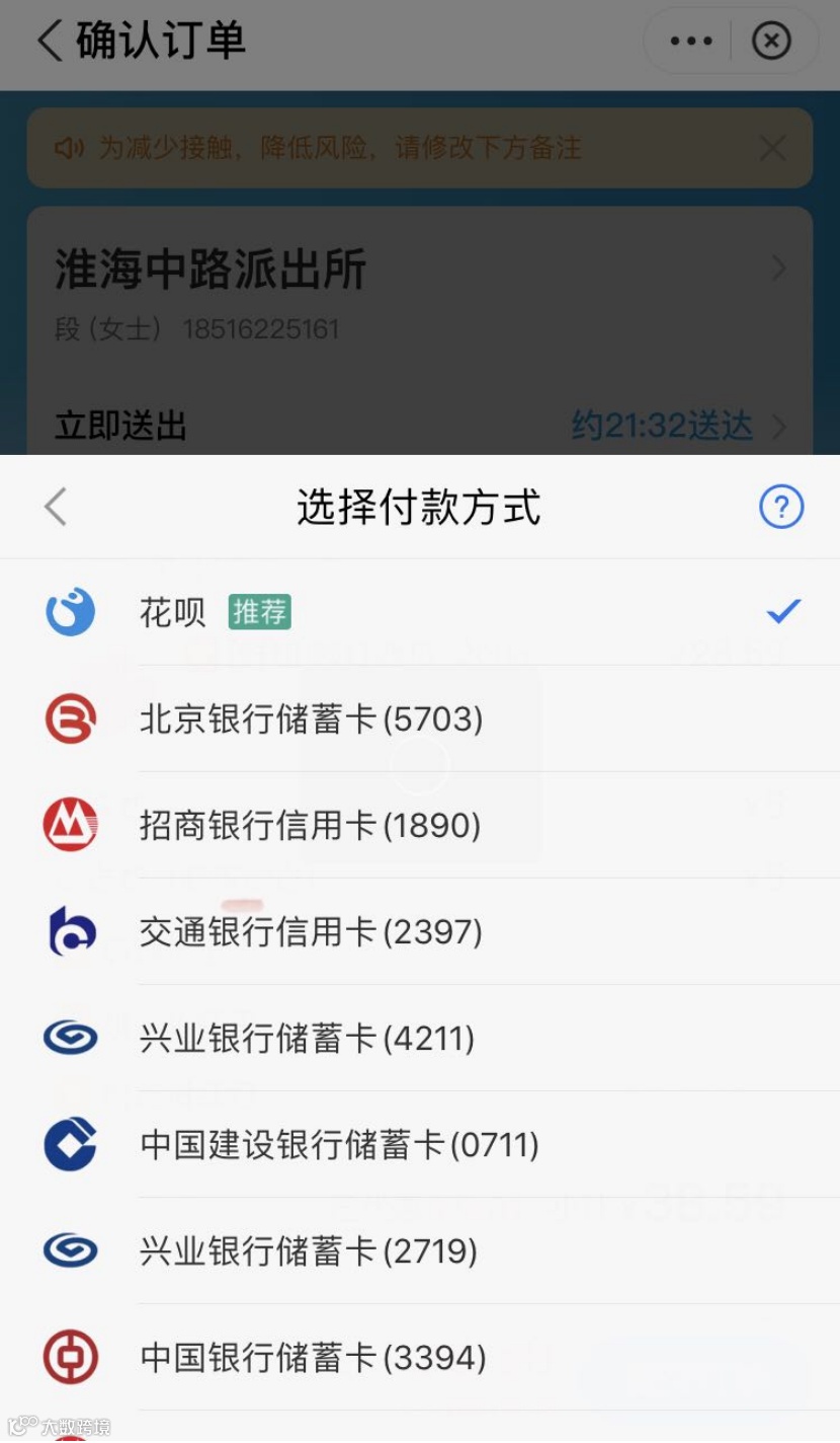 在饿了么APP及支付宝饿了么小程序上,记者点单进入支付环节发现,首选项是支付宝花呗,以及用户绑定的银行卡进行支付。