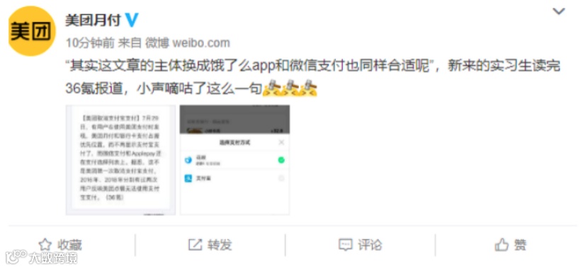 舆情发酵后,同一天下午,微博认证为“重庆美团三快小额贷款有限公司”的美团金融服务平台旗下美团月付官微疑似隔空喊话称,“‘其实这文章的主体换成饿了么APP和微信支付也同样合适呢’,新来的实习生读完36氪报道,小声嘀咕了这么一句。”同时,美团还贴出一张饿了么的支付页面截图,显示只有两种支付方式:花呗、支付宝。