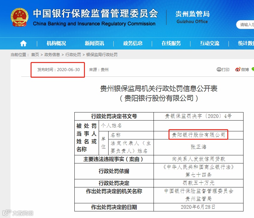 巧合的是,在6月30日,贵阳银行及相关责任人也收到了合计10张罚单,违法违规实施涉及向关系人发放信用贷款、以贷还贷掩盖不良等问题。