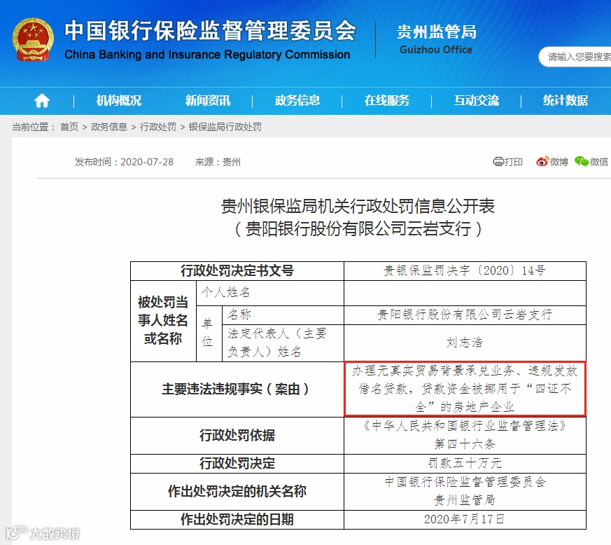 7月28日,贵州银保监局披露,贵阳银行的旗下多家分支行领取了合计7张罚单,累计罚款230万元。