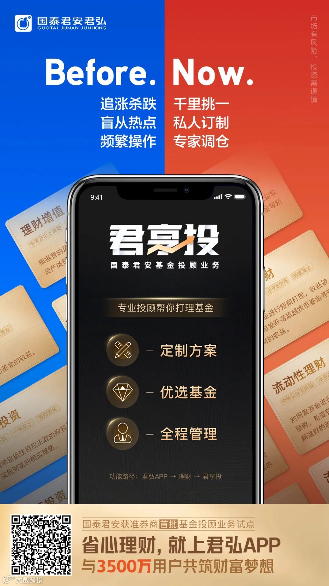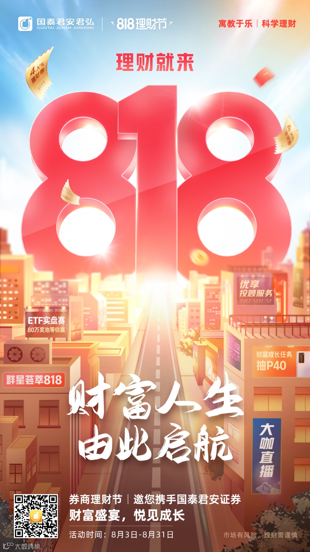 2020年第四届818理财节,是国泰君安吹响数字化财富管理的冲锋号,集国泰君安全集团之力,聚焦海量客户,尤其是青年一代的兴趣偏好,以财富人生成长为主线,围绕“产品+投顾”两大要点,依托君弘APP、君弘灵犀、君弘在线等轻服务为三大载体,探索与银行、保险、基金公司、互联网大流量平台、社会化媒体等平台开展跨界营销,构建共建共享的财富管理生态,倾力打造高品质生活圈。