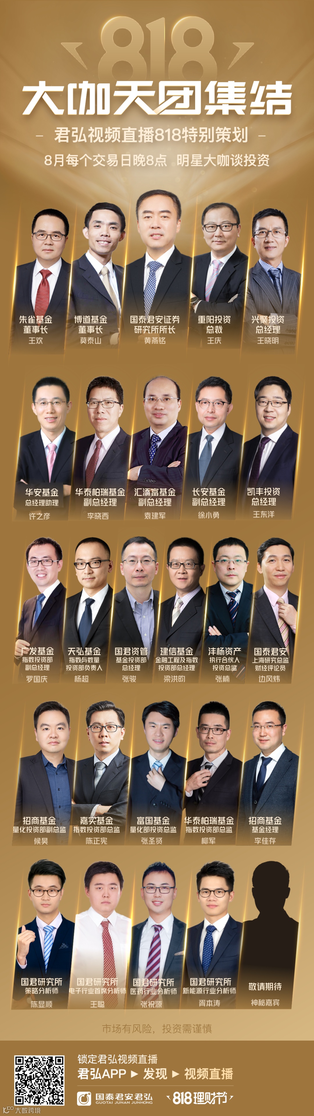 活动期间每天早中晚三场视频直播,研究所所长、基金经理、行业知名分析师等26位大咖云集。嘉宾包括国泰君安研究所所长黄燕铭、博道基金董事长莫泰山、重阳投资总裁兼首席经济学家王庆、朱雀投资董事长王欢、汇添富基金副总经理袁建军、华泰柏瑞基金副总经理李晓西、兴聚投资总经理王晓明、华安基金总经理助理许之彦等多位业内知名人士。