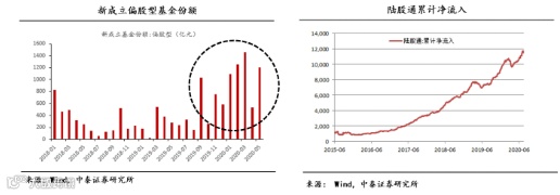 A股市场也有类似的情况,上半年消费增速下降11.4%,居民收入减少1.3%,即居民消费减少比收入减少了10个百分点,故储蓄率上升,增量资金持续进入到的A股市场。同时,美元指数下行,外资也流向中国。所以这两张图其实都反映了新成立的偏股型的基金份额在这几个月内均明显上升,海外资金、北上资金,它累积的流入量也在明显地上升,这两大资金都是以机构资金为主,为我们的股市带来了新的增量。