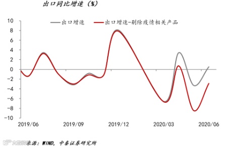 出口还是要好于预期。这里面有两大因素:第一,疫情产品的高增长对出口起到了很大的支撑作用。比如,6月份医疗仪器和器械出口增速扩大到100%,纺织纱线、织物制品出口增速高达56.7%,中药材等出口增速也扩大到11.2%。若剔除这些产品,则6月份增速是-2.9%,所以这是第一个因素。第二,是错位,即全球二季度后都在遭遇疫情,中国二季度后复工复产比较顺利,达产率较高,故此,全球有部分订单就被中国拿走了。这是一个错位的因素。