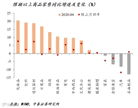 从消费结构来看,必需品的消费依然还是保持高增长,其中粮油食品、饮料、烟酒和日用品,它的增速都超过10%。可选消费品首先分化,汽车的零售是负增长,化妆品、家电、通信器材回升比较明显。在这里需要进一步指出的是,必需品的消费增长10%,这里面主要还是靠消费升级,而不是说我们吃东西吃多了增长10%,这与我们整个的消费升级有关系。既然有疫情的话,大家更加注重消费质量,即品质、安全和品牌 。
