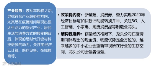 总体而言,在疫情背景之下,股票市场的配置思路,第一个要遵循产业趋势,就是产业的发展方向是什么,比如说新兴产业,比如说居民的消费升级。如在人口老龄化背景下,对健康养老的需求在上升。对于线上的那些教育、医疗设备、云计算、住宅经济等等,我觉得将来可能会有更好的前景。没有疫情之前,其实已经体现出来了,疫情只是加速了大家对这类资产的配置。