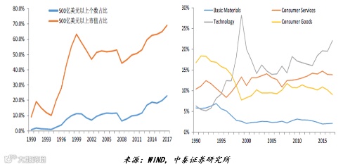 我们再来看一下美国的案例,美国从1990年到2017年,将近30年的时间里面,大市值股票的市值占比从10%不到,到现在的70%以上,所谓大市值是指500亿美元以上市值的,黄线是指市值的占比,市值的占比要占到了70%以上;蓝线是指大市值股票数量的占比,占比上升到20%左右。美国的昨天就是中国的今天,在中国,大市值的股票占比也会继续上升。其次,真正有科技含量的公司股票市值的占比也是明显上升的,基金经理更喜欢配置这些有科技含量的新的产业。