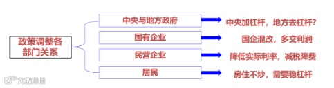 哪三大部门呢?就是政府部门、企业部门和居民部门。政府部门的内部结构其实就是中央政府和地方政府,此次发行特别国债就是要把国债的钱直达地方,这充分表明了中央政府的加杠杆,地方政府至少是稳杠杆,不让它继续上升。另外,政府要对企业降税减费,要处理好与企业部门的结构、企业部门的关系。政府部门除了对企业减税降费之外,也要对居民部门进行减税降费,即减少居民的个税,同时提高对居民社保的补贴,尤其在养老、医疗等方面。这也表明,三大部门之间其实是需要进一步地完善结构、改善结构,解决结构固化的问题。作为企业部门来讲,国有企业也要对民营企业让利,银行作为一个金融企业要对非金融企业让利,两会之后,这些举措也都在加快落地。