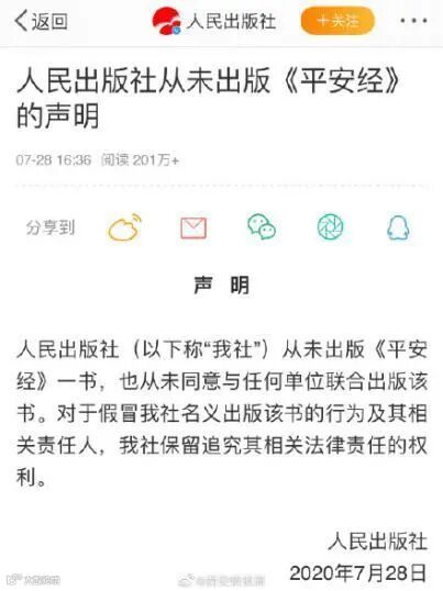 人民出版社(以下称我社)从未出版《平安经》一书,也从未同意与任何单位联合出版该书。对于假冒人民出版社名义出版该书的行为及其相关责任人,保留追究其相关法律责任的权利。