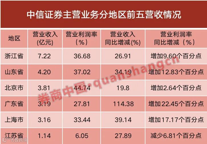 今年一季度,中信证券并表了广州证券,这市并表后首份半年报。在半年报各地区经营情况中,广东省超越上海市,成为中信证券继浙江、山东、北京之后的第四大营收来源地。上半年,中信证券从广东省合计实现营收3.19亿元,比上年同期增幅114.38%,营业利润率比上年同期增加了22.45个百分点。