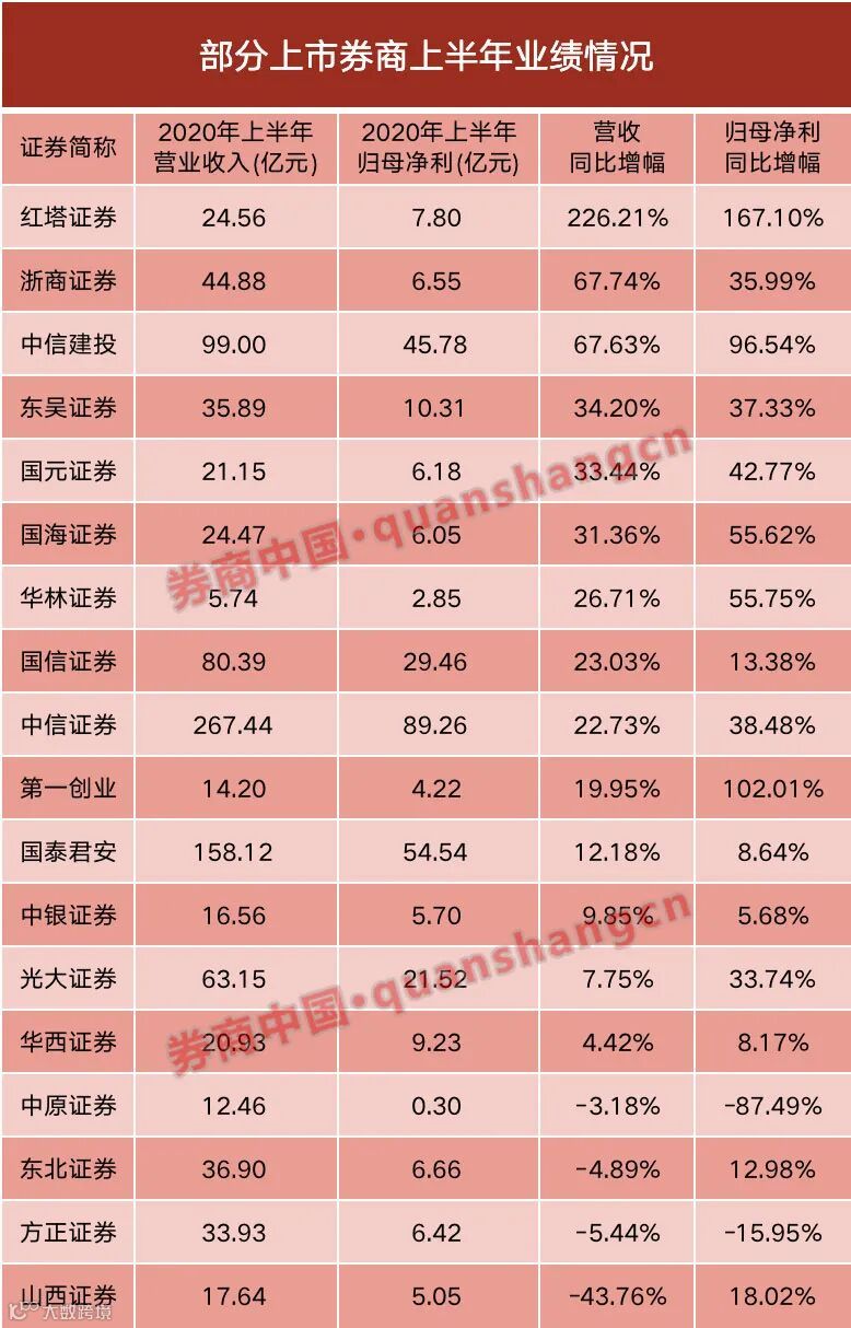 目前,至少已有18家上市券商披露了上半年合并口径业绩情况,中信证券、国泰君安位居前两名,从行业数据来看,马太效应进一步凸显。就营收同比增幅来看,红塔证券以24.56亿元的营收、7.53亿元的归母净利,分别实现了226.21%和67%的同比增幅,均暂居第一,主要与去年同期基数较低相关。