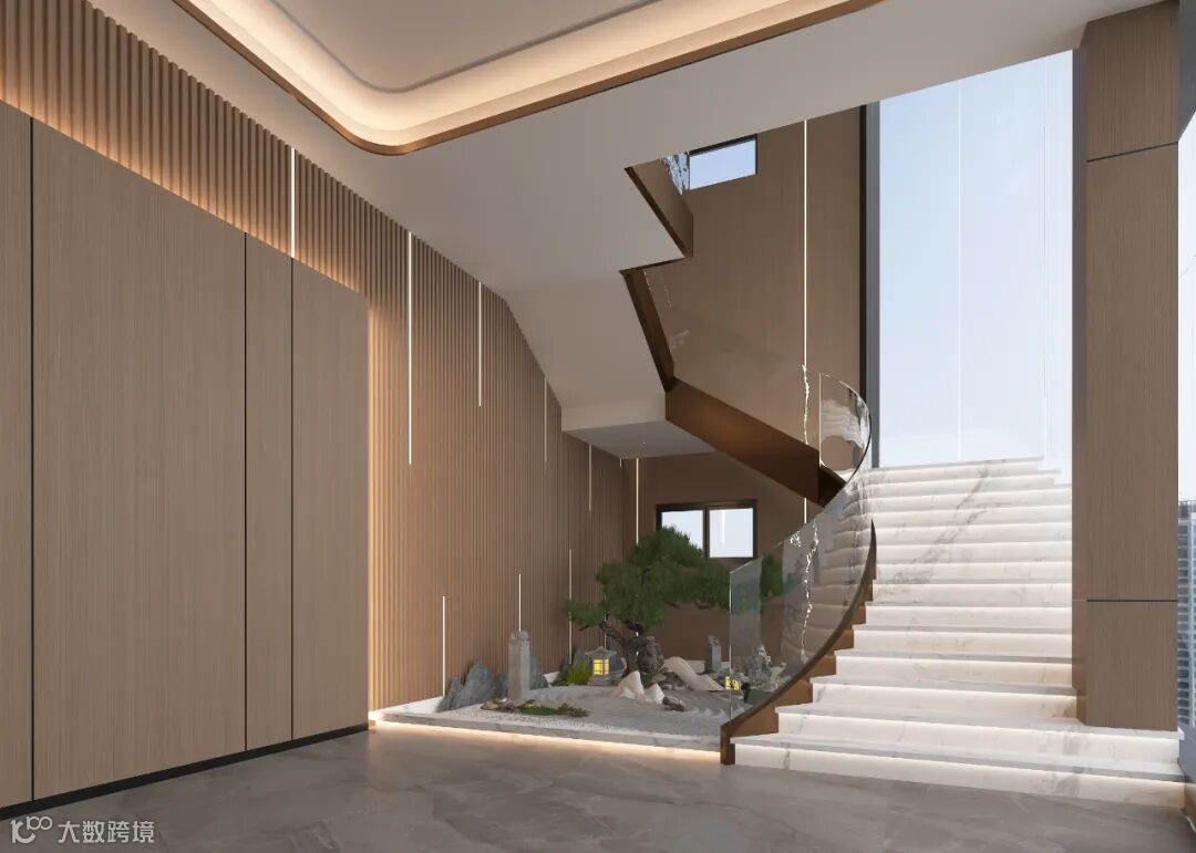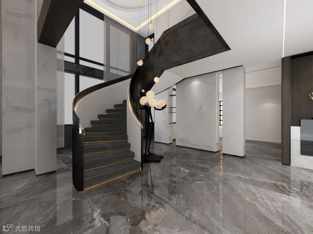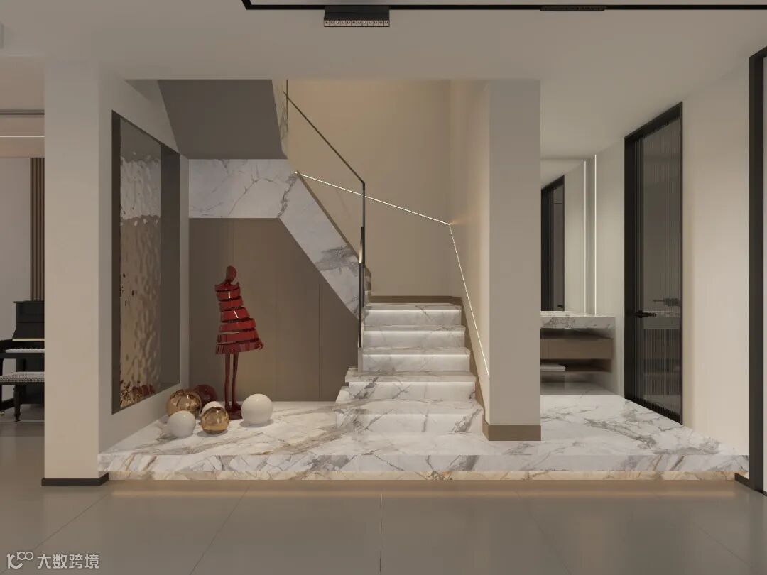 触感系列的超码数细砂干粒让岩板凹凸肌理之外透着5-8°漫光,带出微微的光泽感。就如鱼肚金、麦斯库白、顶级寒江雪及白网纹黑白根于台阶的应用参考中,在灯带的映照下,岩面反射着柔和的光线,结合本身具备的自然质感,能为户主带来视觉与触觉的双重享受。