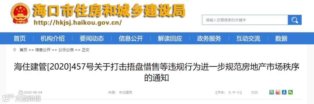 8月4日,海口市住建局发文要求打击捂盘惜售等违规行为,并将与发改、市场监管、市政、税务等部门开展联合执法活动,针对虚假宣传、违法广告、捂盘惜售、无证销售、捆绑销售、价外加价、滞后网签等违法违规行为进行市场整治。