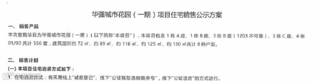 根据方案,本次销售产品共计556套,建筑面积约72、约110平、约125平、约130平共计8种户型,将采取线上“诚意登记”、线下“公证摇取选房顺序号”、线下“公证选房”的方式进行。