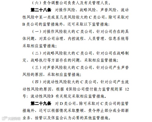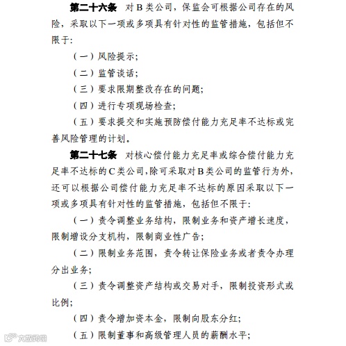 银保监会表示,上述措施中,第(一)项至第(四)项是必须采取的措施,第(五)项之后的为根据保险公司的风险成因而选择采取的措施。