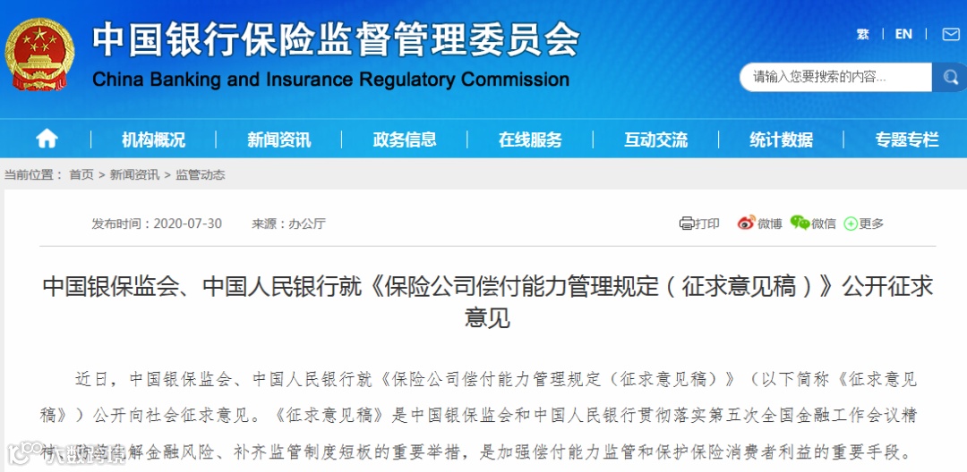 7月30日,中国银保监会、中国人民银行就《保险公司偿付能力管理规定(征求意见稿)》向社会公开征求意见,各方意见反馈截止时间为8月29日。待此次征求意见结束后,银保监会将会同人民银行对《征求意见稿》进一步修改完善后适时发布。