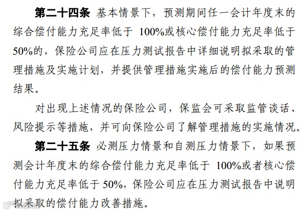 《征求意见稿》规定,对于核心偿付能力充足率低于50%或综合偿付能力充足率低于100%的保险公司,中国银保监会应当采取以下第(一)项至第(四)项的全部措施: