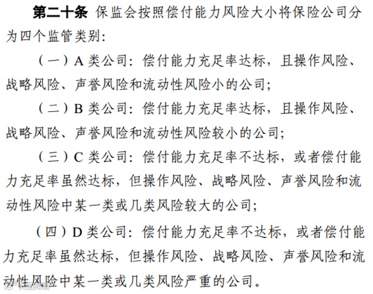 现行偿二代规则对偿付能力充足与否的规定,基本与此一致。偿二代已明确风险综合评级A类、B类公司为偿付能力达标公司;对核心偿付能力充足率和综合偿付能力充足率,虽然没有明确规定50%、100%以下不达标,但分别设置了50%、100%的“警戒线”。