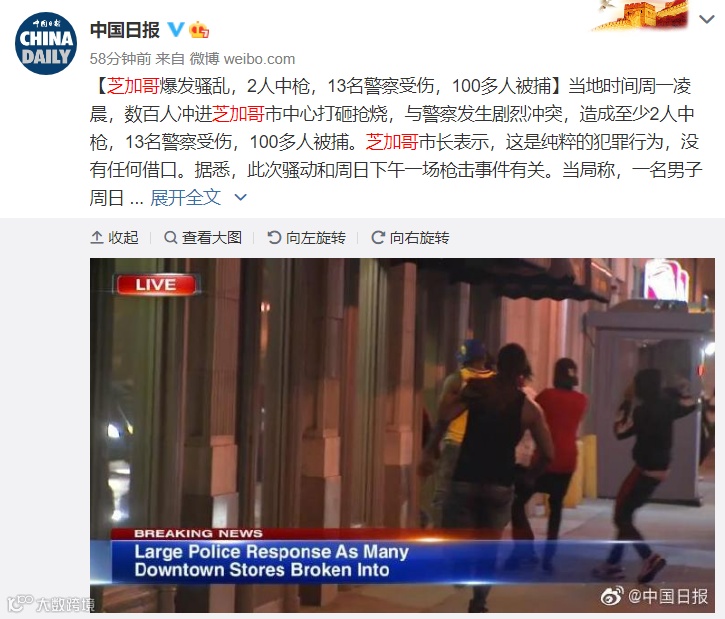 据中国日报消息,当地时间周一凌晨,数百人冲进芝加哥市中心打砸抢烧,与警察发生剧烈冲突,造成至少2人中枪,13名警察受伤,100多人被捕。