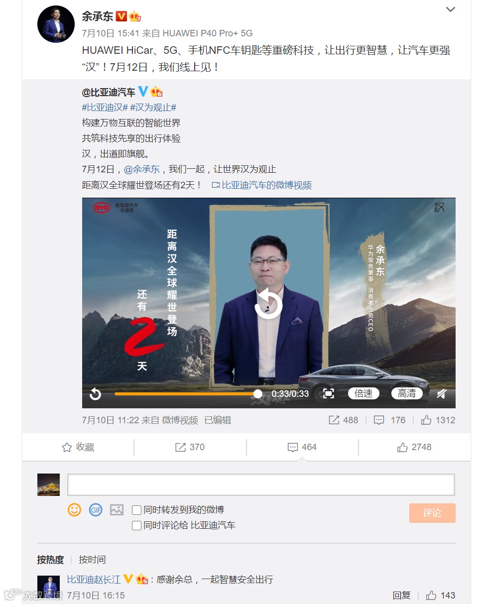 7月12日,比亚迪汽车发布智能新能源旗舰轿车——比亚迪汉。华为消费者业务CEO余承东与比亚迪董事长王传福同时出席,宣布了基于鸿蒙OS的华为HiCar系统的首次亮相,见证HUAWEI HiCar在这款汽车上的落地和实装。