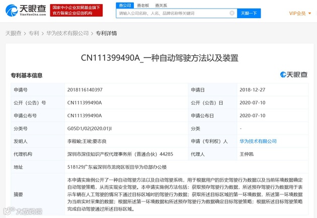 近日,在华为技术有限公司新增的数十条专利信息中,“一种自动驾驶方法以及装置”赫然在列。该专利申请日为2018年12月27日,申请公布日为2020年7月10日。专利摘要显示,该专利申请实施例公开了一种自动驾驶方法以及自动驾驶系统,用于根据用户的历史驾驶行为数据以及当前环境数据确定自动驾驶策略,从而实现安全驾驶。
