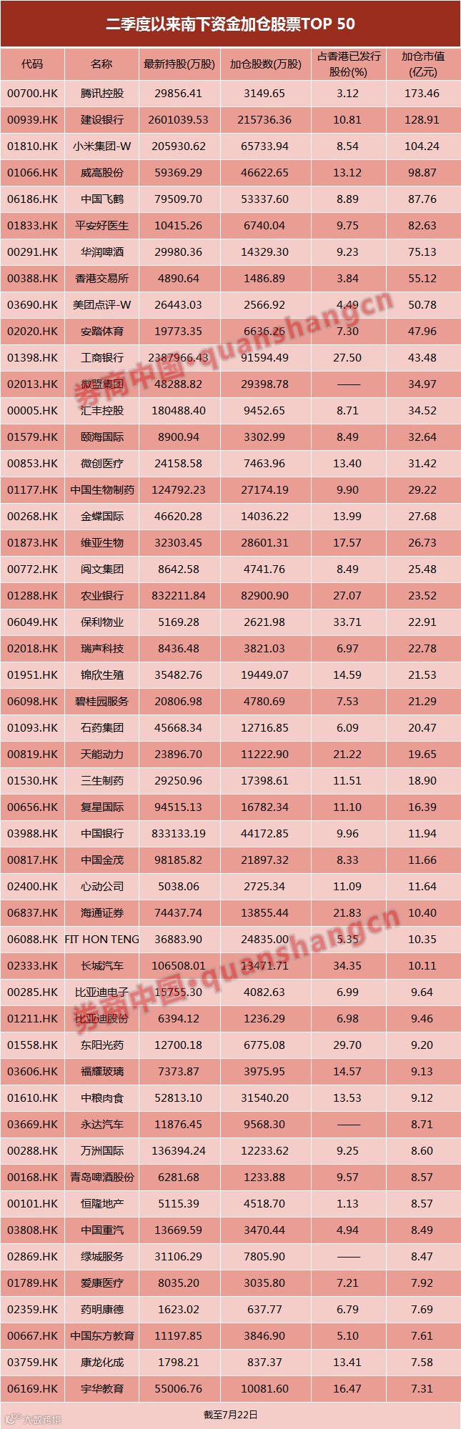 最新数据显示,4月1日至7月22日,南下资金加仓最多的股票分别是腾讯控股、建设银行、小米集团-W、威高股份、中国飞鹤、平安好医生、华润啤酒、香港交易所、美团点评-W、安踏体育,以期间成交均价粗略计算,南下资金对腾讯控股、建设银行、小米集团-W加仓资金超过100亿元。