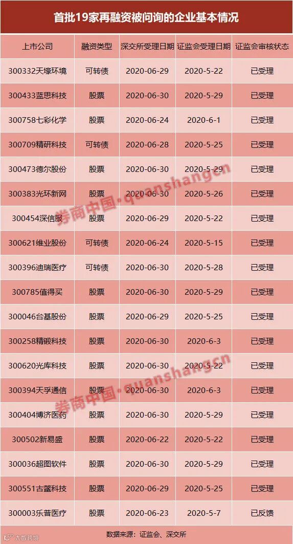 7月10日深交所发出创业板试点注册制下首批再融资审核问询函,共对19家在审企业提出问询,其中4家可转债,15家定增。