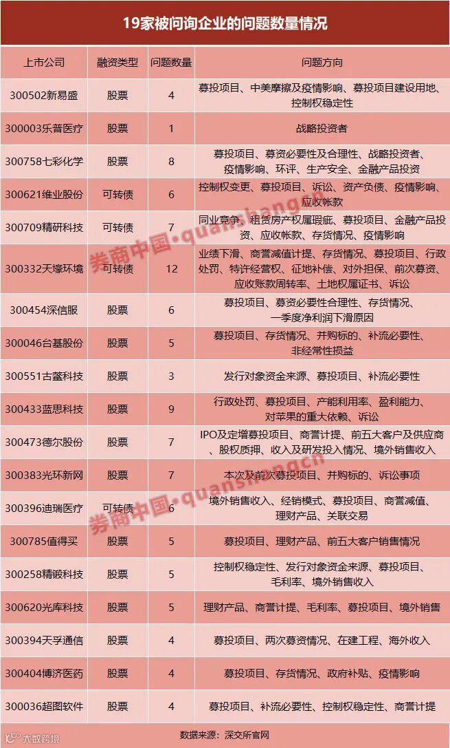 根据券商中国记者梳理,19家企业共被问出108个问题,平均每家被问询约6个问题。其中天壕环境可转债项目被问询最多,共有12个问题;乐普医疗定增项目被问询问题最少,仅有1个。