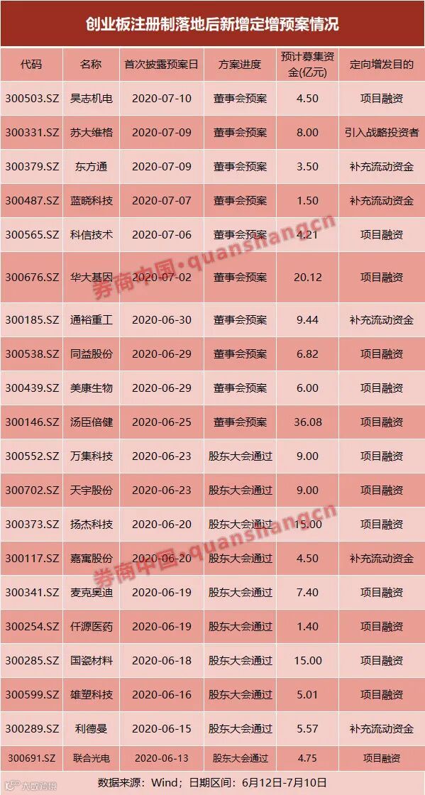同时值得注意的是,创业板注册制让存量企业有改革获得感,定增积极性上升。自6月12日(改革落地)至7月10日期间,根据Wind统计共有20家创业板公司披露新的定增预案,去年同期仅有1家。
