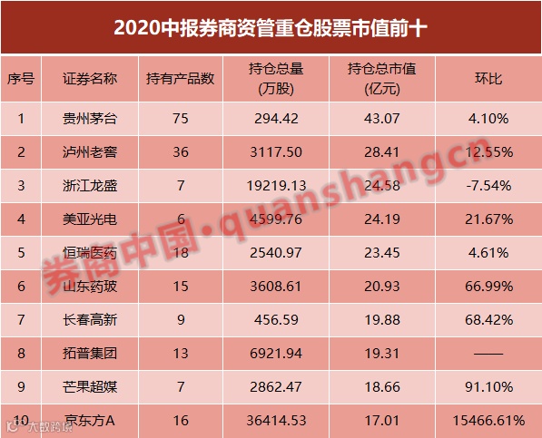 据Wind数据,截至8月3日,券商资管产品的近300只重仓股一一浮现,从持有市值来看,即便贵州茅台和泸州老窖二季度均遭到券商资管部分减持,但得益于白酒股近期强势的行情,两只个股仍旧稳居券商资管产品持有市值的前两位。