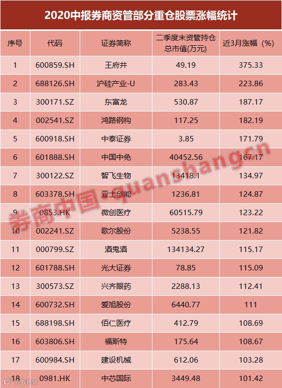 与此同时,两只科创板个股沪硅产业和佰仁医疗也在近3个月内成功实现股价翻倍,分别录得涨幅223.86%和108.69%,而中芯国际的港股股价也随着其登陆科创板,在近三个月内获得了101.42%的涨幅。此外近期涨幅排名靠前的券商资管重仓股中,还包括券商新股中泰证券和被传有望与光大银行合并的光大证券两只金融股。