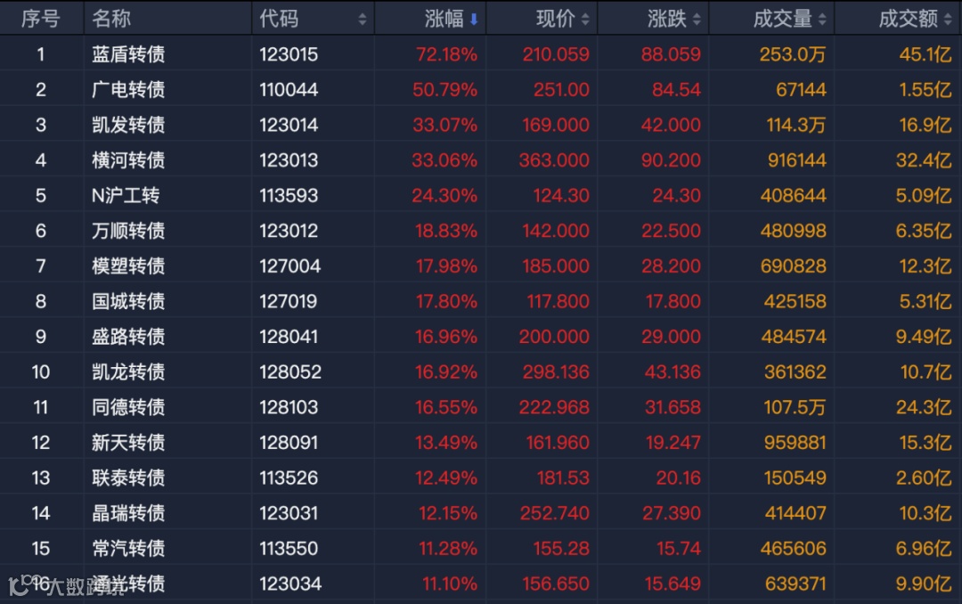 8月10日转债市场游资狂欢,沪深两市合计有11只转债因涨幅过大而被临时停牌。蓝盾转债当天大涨72.18%,成交额逾45亿;横河转债连续2个交易日暴涨116%。