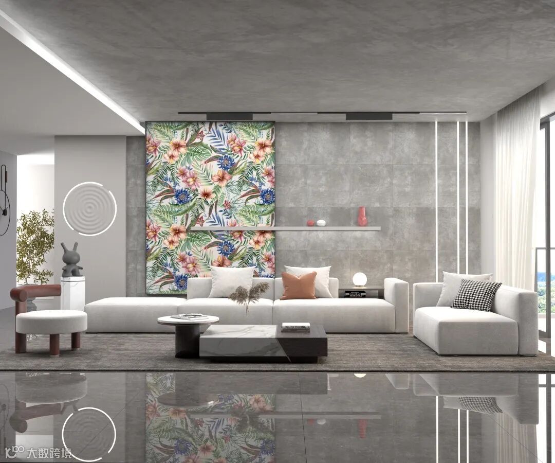 在客厅,墙壁嵌入了呼应周边的花海风景的拼贴,同时限定于一个特定的审美语言,以同样的风格色调将不同的艺术相结合。垂直墙壁上白色陶瓷,或是多种装饰图案的瓷砖,都在呼应着整体空间的气氛。
