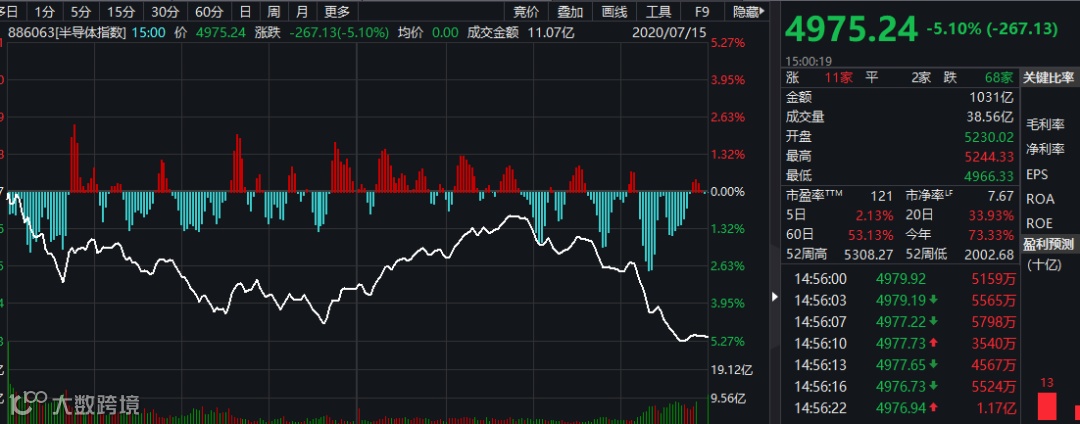 据wind资讯中的半导体指数行情,近期半导体指数成交金额约为1000亿左右。若中芯国际上市,首日成交有可能超过半导体板块一半以上成交量。所以,这只股票对整个板块造成了巨大冲击。沪硅产业这匹黑马也栽了,由涨逾5%变成大跌近20%,整个板块指数杀跌超5%,市值跌去近1200亿元。