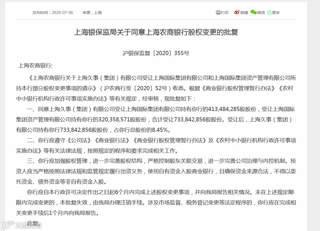 上海银保监局披露的批复称,同意上海久事(集团)有限公司受让上海国际集团有限公司持有上海农商行的413,484,285股股份,受让上海国际集团资产管理有限公司持有上海农商行的320,358,571股股份,合计受让733,842,856股股份。受让后,上海久事(集团)有限公司持有上海农商行733,842,856股股份,占该行总股份的8.45%。