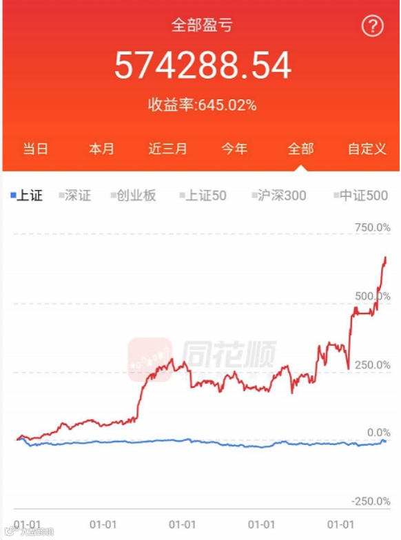 三哥展示了一个当初5w起步的账户,现在有57万,同花顺只记录了从16年到现在的收益率,这个数字是645.02%。